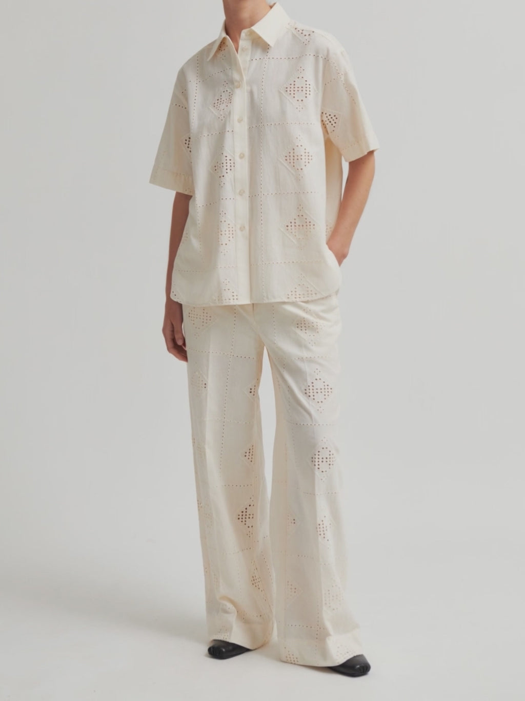 Second Female trousers with hole pattern. The trousers are made in smooth cotton with cutwork embroidery. Featuring a covered elasticated waistband, slanted pockets and decorative back pockets. Lined to the hips. Mid waist with wide, straight legs.