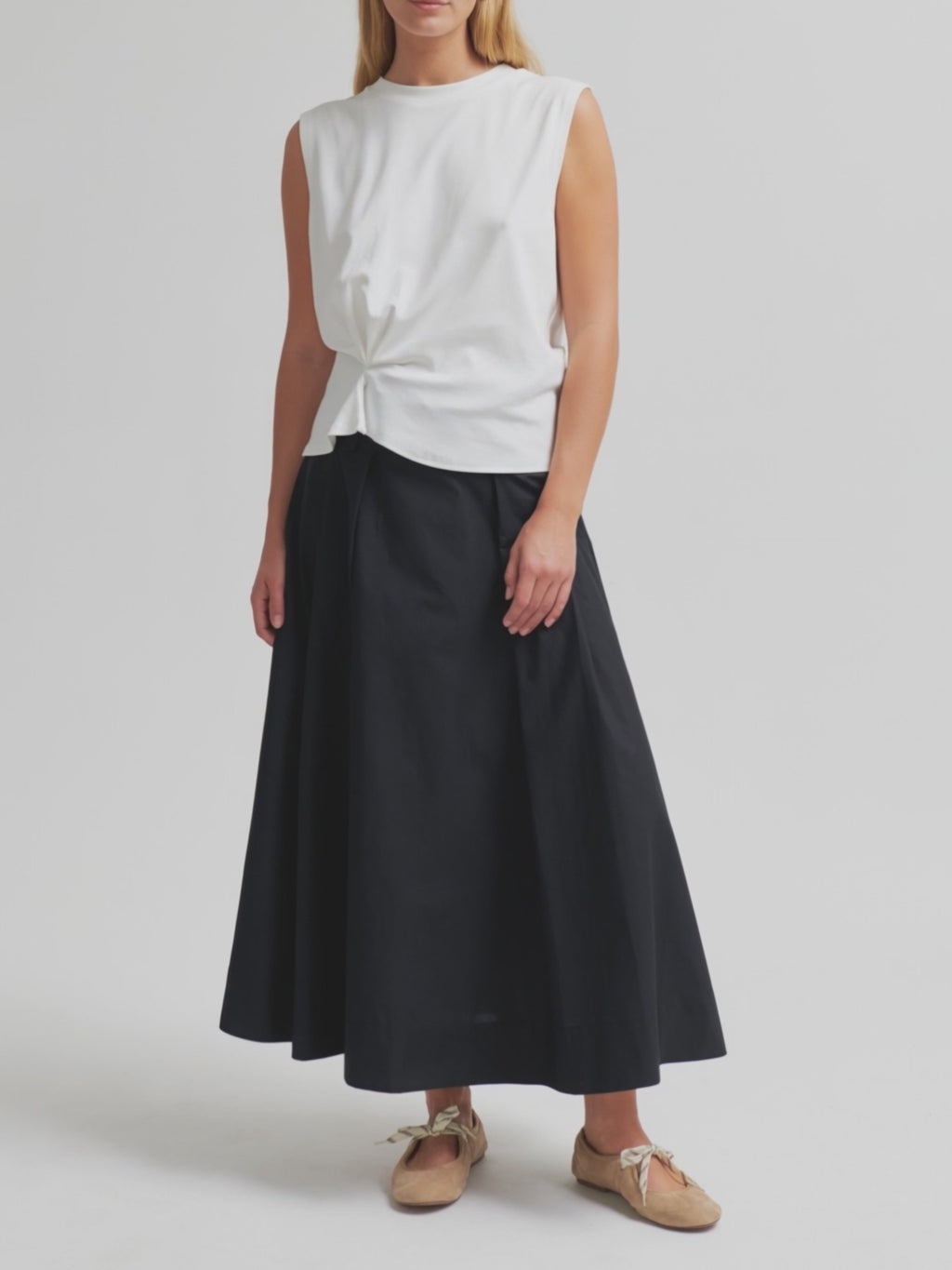 Second Female gathered sleeveless tee. The t-shirt is made in a soft, stretchy lyocell-cotton blend. Featuring a round neckline and deep cut armholes. Gathered detail at front that creates draped effect. Relaxed fit at top with more fitted waist.