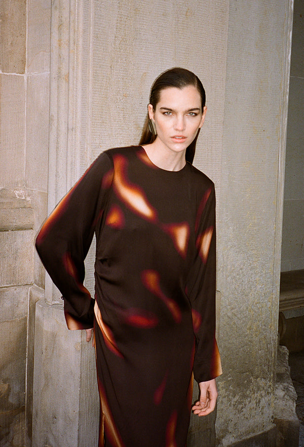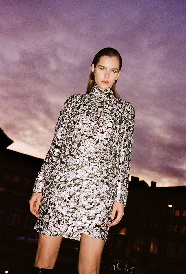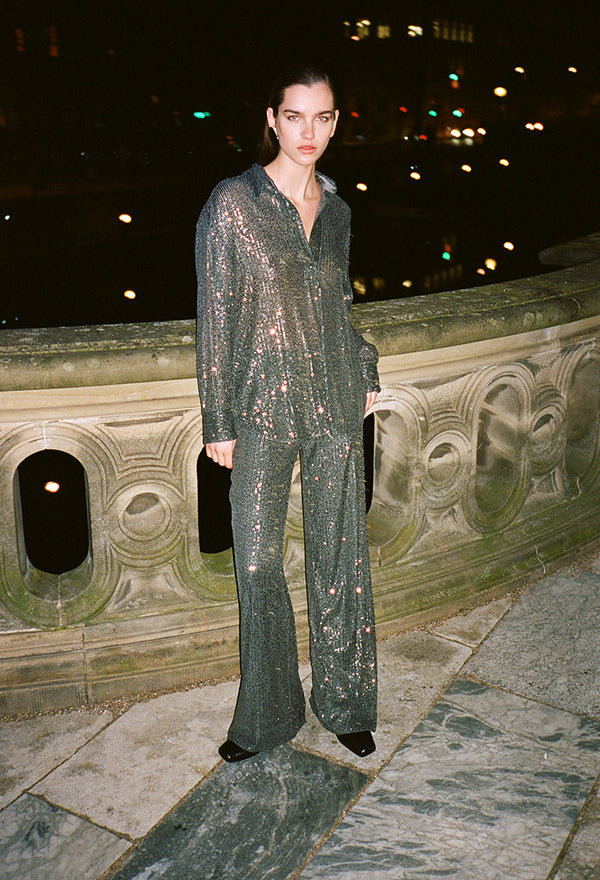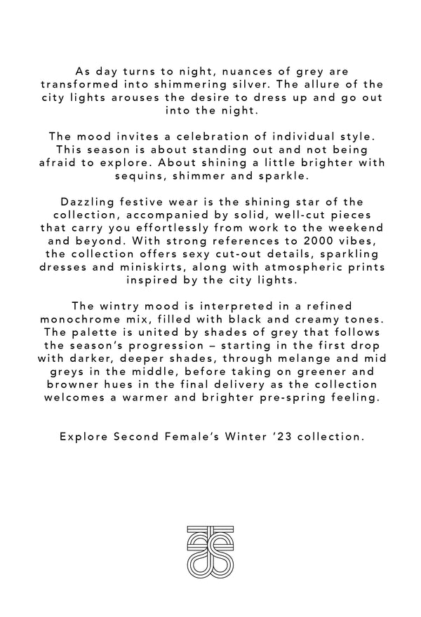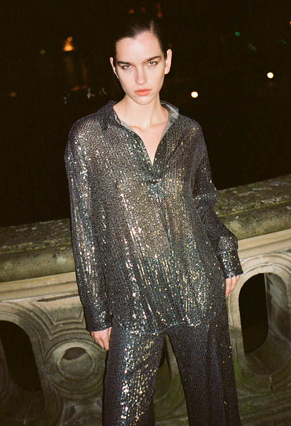 A muted palette of deep neutrals, metallic reflections, and bold black captures the quiet intensity of the night, where mystery and individuality take center stage. Glossy satin meets textured wool, shimmering sequins contrast with matte cotton, and soft fabrics blend seamlessly.